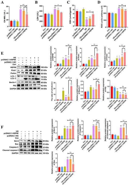 HSP90 overexpression reduces heat stress-induced PCWs damage and apoptosis, while enhancing mitophagy. (A,B) The levels of CK-MB and LDH in PCWs with or without HSP90 overexpression after heat stress. Measurement data are expressed as mean ± SEM. * p < 0.05, ** p < 0.01, n = 3. (C,D) The levels of ROS and GSH in PCWs with or without HSP90 overexpression after heat stress. Measurement data are expressed as mean ± SEM. * p < 0.05, ** p < 0.01, n = 3. (E) HSP90, Pink1, Parkin, LC3, Beclin-1, and P62 in PCWs with or without HSP90 overexpression after heat stress were detected via Western blot analysis with the indicated antibodies. Representative bands are shown. Data are expressed as the means ± SEM. * p < 0.05, ** p < 0.01, n = 3. (F) Bcl-2, Bax, Caspase-3, and cleaved caspase-3 in PCWs with or without HSP90 overexpression after heat stress were detected via Western blot analysis with the indicated antibodies. Representative bands are shown. Data are expressed as the means ± SEM. * p < 0.05, ** p < 0.01, n = 3.