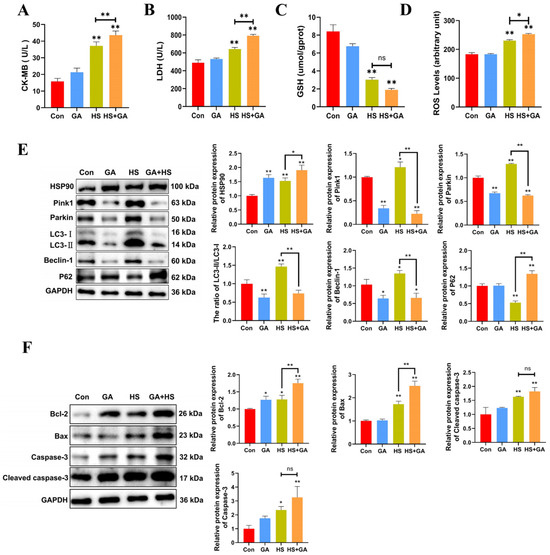 Inhibition of HSP90 function leads to increased apoptosis and damage, with downregulated mitophagy in heat-stressed PCWs. (A,B) The levels of CK-MB and LDH in PCWs treated with or without GA after heat stress. Measurement data are expressed as mean ± SEM. * p < 0.05, ** p < 0.01, n = 3. (C,D) The levels of ROS and GSH in PCWs treated with or without GA after heat stress. Measurement data are expressed as mean ± SEM. * p < 0.05, ** p < 0.01, n = 3. (E) HSP90, Pink1, Parkin, LC3, Beclin-1, and P62 in PCWs treated with or without GA after heat stress were detected via Western blot analysis with the indicated antibodies. Representative bands are shown. Data are expressed as the means ± SEM * p < 0.05, ** p < 0.01, n = 3. (F) Bcl-2, Bax, caspase-3, and cleaved-caspase-3 in PCWs treated with or without GA after heat stress were detected via Western blot analysis with the indicated antibodies. Representative bands are shown. Data are expressed as the means ± SEM. * p < 0.05, ** p < 0.01, n = 3.