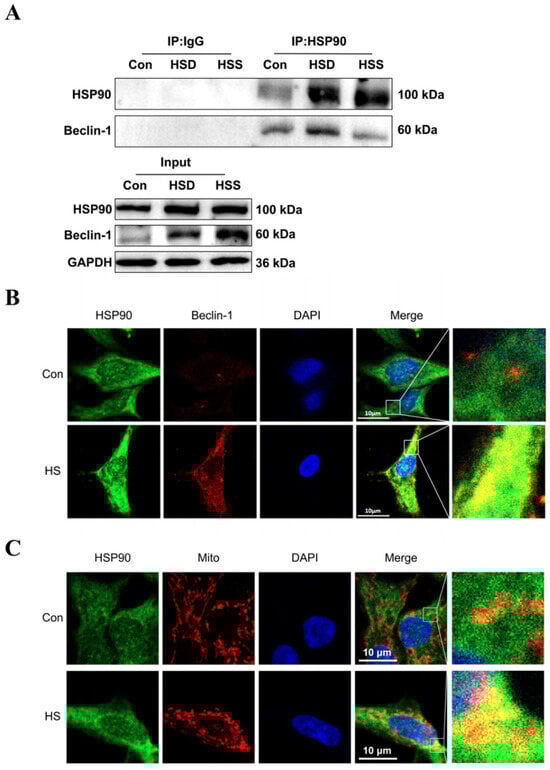 Previous studies have demonstrated that Beclin-1 serves as a common marker of mitophagy, while HSP90 can form a complex with Beclin-1 through its conserved domain, thereby maintaining Beclin-1 stability and regulating autophagy [25]. To investigate whether HSP90 directly interacts with Beclin-1 in heat-stressed cardiomyocytes of WCCs, we conducted coimmunoprecipitation (Co-IP) experiments. The results revealed specific interactions between HSP90 and Beclin-1 in the cardiac tissues of WCC from the Con, HSS, and HSD groups (Figure 7A). Furthermore, in heat-stressed PCWs, increased signals for HSP90 and Beclin-1 were strongly colocalized in the cytoplasm (Figure 7B). Additionally, elevated levels of HSP90 and intensified colocalization signals of HSP90 with mitochondria were observed in heat-stressed PCWs, suggesting that mitochondrial translocation of HSP90 occurs under heat stress conditions (Figure 7C). These findings indicate that during heat stress, HSP90 may regulate mitophagy by enhancing its interaction with Beclin-1.