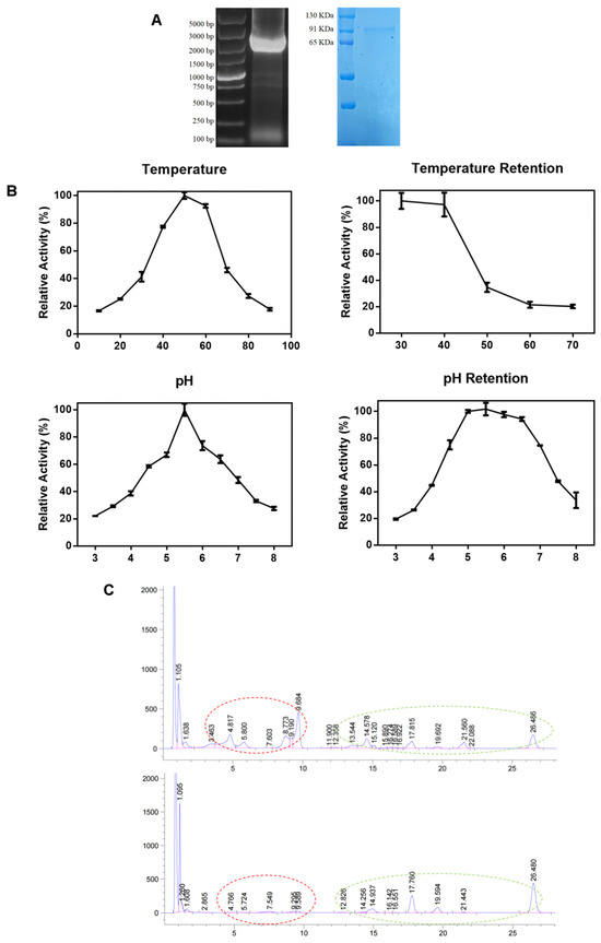 The gene encoding β-glucosidase derived from Aspergillus niger alongside the heterologously expressed protein (Figure 1A). The enzymatic properties showed that optimal enzyme activity occurs at 40 °C, declining sharply above 50 °C and enzyme activity remains robust within a pH range of 4.5–7, peaking at 5.5 (Figure 1B). Subsequent enzymatic hydrolysis, as evidenced by HPLC (Figure 1C), demonstrates an almost complete conversion of glycosides into aglycon soy isoflavones. Specifically, the conversion rates for daidzin, glycitin, and genistin were 82.31%, 73.84%, and 91.03%, respectively (Table 1). These findings underscore the capability of β-glucosidase sourced from Aspergillus niger in transforming glycosidic soy isoflavones present in soybean meal into their aglycon forms.