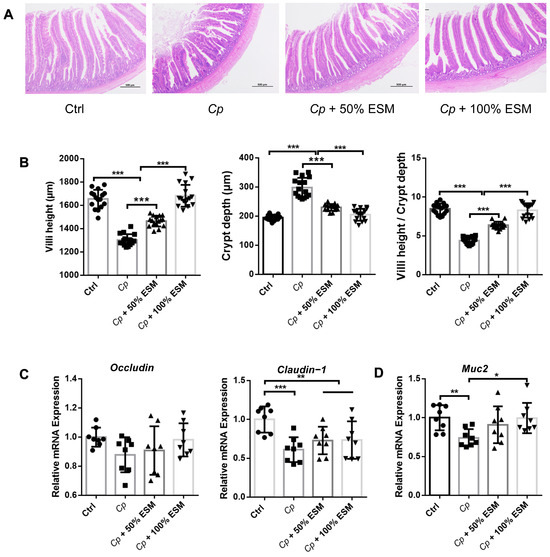 H&E staining demonstrated that broilers in the Cp group exhibited decreased villus height and the ratio of villus height to crypt depth (VH/CD) and enhanced crypt depth compared with broilers in the control group (Figure 2A,B). However, ESM treatment increased the villus height and VH/CD and decreased crypt depth of the jejunum in Cp-infected broilers (Figure 2A,B). Cp infection results in diminished tight junction protein expression, an effect not significantly reversed by ESM (Figure 2C). Muc2 expression is significantly upregulated induced by Cp, recovered by ESM (p < 0.05) (Figure 2D). Collectively, these data demonstrated that ESM ameliorated the intestinal epithelial barrier function of broilers infected with Clostridium perfringens.