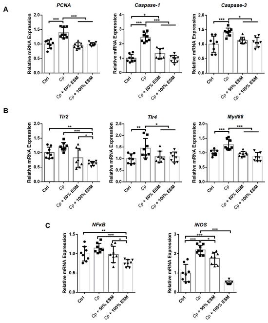 qRT-PCR analysis explored that genes related to cell proliferation (PCNA) and apoptosis (Caspase-1 and Caspase-3) exhibit elevated expression in the Cp group, which ESM attenuated (p < 0.05) (Figure 3A). Furthermore, expression of Tlr2, Tlr4, and Myd88 is reduced in the control and ESM groups compared to the Cp group (p < 0.05) (Figure 3B). Additionally, NFκB and iNOS expression is markedly downregulated (p < 0.01) in both control and ESM groups compared to the Cp group (Figure 3C). These findings suggest that enzymatic soybean meal substitution can alleviate the detrimental effects of Clostridium perfringens infection on intestinal epithelial homeostasis.