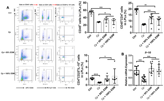 Employing flow cytometry, we analyzed the frequency of lamina propria lymphocytes, while qRT-PCR elucidated the expression patterns of pertinent cytokines within jejunal tissues (Figure 4, Figure 5 and Figure 6). Notably, the frequencies of CD45+, CD45+CD4+, and CD4+CD25+IL-10+ cells were significantly elevated (p < 0.05) in both the control and ESM groups, in stark contrast to the Cp group (Figure 4A). Additionally, Il-10 mRNA expression demonstrated a highly significant increase (p < 0.01) in these groups (Figure 4B), indicating that ESM augments Treg-cell activity and IL-10 production in the jejunal lamina propria during Cp infection.