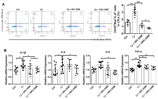 Examining macrophage frequencies and cytokine expression, we observed a marked upregulation of macrophages in the Cp group (p < 0.01) (Figure 5A), which was attenuated by ESM. In parallel, the secretion of pro-inflammatory cytokines (Il-1β, Il-6, Il-8, and Tnf-α) by macrophages was significantly diminished (p < 0.05) in the control and ESM groups compared to the Cp group (Figure 5B). These findings underscore the capacity of ESM to decrease macrophage frequency and expression of pro-inflammatory cytokines triggered by Cp.