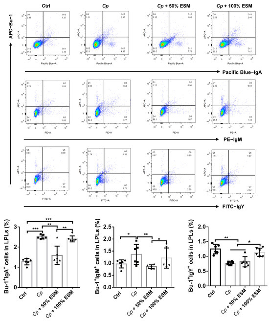 Further flow cytometric analysis of plasma cell subsets (Bu-1+IgY+, Bu-1+IgA+ and Bu-1+IgM+) in the jejunal lamina propria revealed that Cp infection notably augmented the frequency of Bu-1+IgA+ and Bu-1+IgM+ plasma cells (p < 0.05) (Figure 6). However, the use of ESM demonstrated a mitigating effect on this elevation, highlighting its role in regulating the plasma cell composition in the jejunal lamina propria post-Cp challenge.
