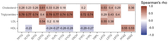 Correlogram of lipoproteins measured by NMR and routine analyses. Only significant correlations are shown. The colour indicates whether the correlation is positive (red) or negative (blue), and the intensity of the colour corresponds to Spearman’s ρ. Abbreviations; HDL—High-density lipoprotein, H1A2—HDL-1 Apo-A2, H2A2—HDL-2 Apo-A2, IDTG—IDL triglycerides, LDL—Low-density lipoprotein, LDTG—LDL triglycerides, L4TG—LDL-4 triglycerides, L5TG—LDL-5 triglycerides, L6TG—LDL-6 triglycerides, TPTG—Total triglycerides, VLFC—VLDL free cholesterol, VLPL—VLDL phospholipids, VLTG—VLDL triglycerides, V1CH—VLDL-1 cholesterol, V1FC—VLDL-1 free cholesterol, V1PL—VLDL-1 phospholipids, V1TG—VLDL-1 triglycerides, V5CH—VLDL-5 cholesterol, and V5PL—VLDL-5 phospholipids.