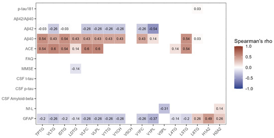 Correlogram of lipoproteins of interest and clinical parameters. Only significant correlations are shown. The colour indicates whether the correlation is positive (red) or negative (blue), and the intensity of the colour corresponds to Spearman’s ρ. Abbreviations; ACE—Addenbrooke’s cognitive examination, FAQ—Functional Activities Questionnaire, GFAP—Glial fibrillary acidic protein, H1A2—HDL-1 Apo-A2, H2A2—HDL-2 Apo-A2, IDTG—IDL triglycerides, LDTG—LDL triglycerides, L4TG—LDL-4 triglycerides, L5TG—LDL-5 triglycerides, L6TG—LDL-6 triglycerides, MMSE—Mini-Mental State examination, Nf-L—Neurofilament light, p-tau—Phospho-tau, t-tau—Total-tau, TPTG—Total triglycerides, VLFC—VLDL free cholesterol, VLPL—VLDL phospholipids, VLTG—VLDL triglycerides, V1CH—VLDL-1 cholesterol, V1FC—VLDL-1 free cholesterol, V1PL—VLDL-1 phospholipids, V1TG—VLDL-1 triglycerides, V5CH—VLDL-5 cholesterol, and V5PL—VLDL-5 phospholipids.