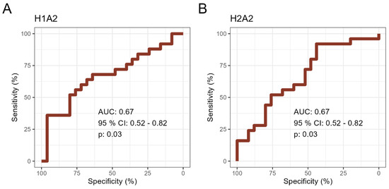 Receiver operating characteristics (ROC) curves for lipoproteins with an area under the curve (AUC) > or ~0.7. ROC curves representing the ability of lipoproteins to differentiate between AD patients and healthy individuals for (A) HDL–1 Apo-A2 (H1A2) and (B) HDL–2 Apo–A2 (H2A2). AUCs with 95% confidence interval (CI) and p–values are reported.