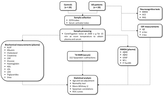 Flowchart of the methods and statistical analysis included. Abbreviations: 1H NMR—Proton nuclear magnetic resonance, Aβ—Amyloid-β, ACE—Addenbrooke’s Cognitive Examination, AD—Alzheimer’s disease, ALAT—Alanine transaminase, Con–Healthy control, CRP—C-reactive protein, CSF—Cerebrospinal fluid, EDTA—Ethylenediaminetetraacetic acid, FAQ—Functional Activities Questionnaire, GFAP—Glial fibrillary protein, HDL—High-density lipoprotein, LDH—Lactate dehydrogenase, LDL—Low-density lipoprotein, MMSE—Mini-Mental State Examination, Nf-L—Neurofilament light, p-tau—Phospho-tau, ROC—Receiver operating characteristic, SIMOA—Single molecule array, t-tau—Total-tau.