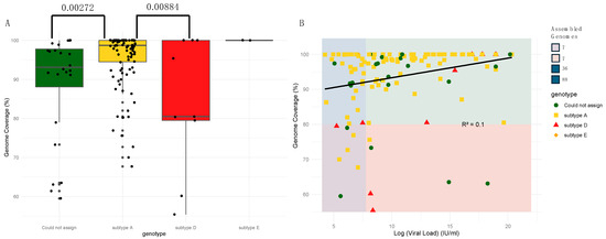 (A) Comparison of genome coverage for different detected HBV genotypes. The boxes indicate the lower quartile, median, and upper quartile minimum and maximum values by the whiskers. Significant differences between genome coverage (paired Wilcoxon test) values between each genotype are denoted above the box and whisker plots. (B) Scatter plot for log viral load against the genome coverage for detected HBV genotypes. A total of 124 genomes with >80% coverage was produced (36 with a log viral load of <7.6 IU/mL and 88 with a log viral load of >7.6 IU/mL). HBV genotypes are represented by different colors and shapes. The different background color shades represent different quality control groups. The blue and purple shades represent ≤7.6 IU/mL log viral load and coverage of ≥80% and <80%, respectively. The green and pink shades represent a log viral load of >7.6 IU/mL and coverage of ≥80% and <80%, respectively.