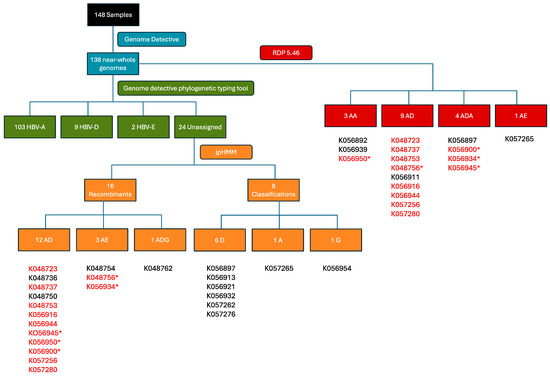 Flowchart showing the identification of recombinants using the jpHMM HBV tool and RDP5.46. The blue section shows the number of genomes produced by the genome detective, the green section shows genotype variation as assessed by the genome detective hepatitis B phylogenetic typing tool; the orange section highlights the jpHMM recombination classifications of the unclassified sequences, and the red section shows the RDP5.46 recombination analysis. Sample IDs are shown below the flowchart sections, and IDs that are shown in red highlight recombinants that both jpHMM and RDP5.46 detected. Sample IDs marked with a “*” were classified as different recombinants by jpHMM and RDP5.46.