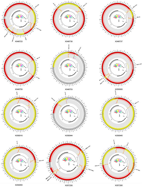 - Krzywinski, M.; Schein, J.; Birol, I.; Connors, J.; Gascoyne, R.; Horsman, D.; Jones, S.J.; Marra, M.A. Circos: An information aesthetic for comparative genomics. Genome Res. 2009, 19, 1639–1645. [Google Scholar] [CrossRef]