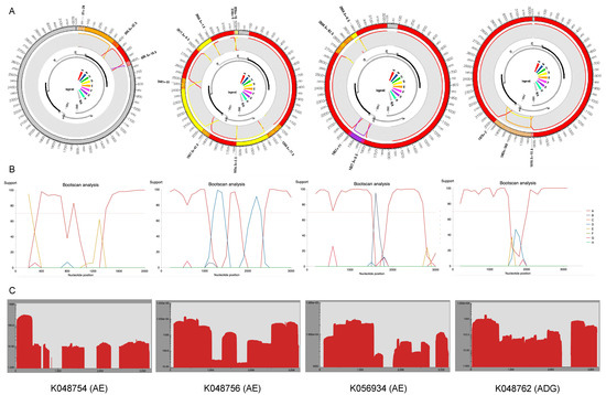 - Martin, D.P.; Posada, D.; Crandall, K.; Williamson, C. A modified bootscan algorithm for automated identification of recombinant sequences and recombination breakpoints. AIDS Res. Hum. Retroviruses 2005, 21, 98–102. [Google Scholar] [CrossRef] [PubMed]