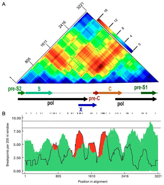 Others have also detected recombination hotspots within the C region, pre-C, P, and X genes [39]. These regions were also frequently transferred during recombination events and, as a result, may impact the diagnosis and treatment of HBV since coinfection and viral recombination can trigger greater virulence and result in a worsened patient clinical status [33].