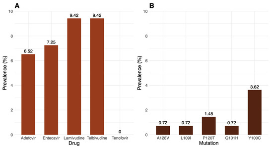 Mutations related to HBsAg escape and drug resistance in the overlapping RT/HBsAg genome region were determined using Geno2pheno-HBV. Among the 138 sequences, thirteen (9.42%) were likely resistant to lamivudine and telbivudine. Ten (7.25%) were resistant to entecavir, and nine (6.52%) were resistant to adefovir. However, all sequences were likely susceptible to tenofovir (Figure 6A). 204V and 180M are the most prevalent drug-resistance mutations (Table 2). The most common vaccine escape HBsAg mutation is 100C, which is responsible for HBV detection failure [29], with a prevalence of five (3.62%). The second most prevalent HBsAg mutation is 120T, which is responsible for vaccine, immunotherapy, and diagnostic detection failure, with a prevalence of two (1.45%). This is followed by mutations 128V, 109I, and 101H, each with a prevalence of one (0.72%), which are responsible for vaccine escape (Figure 6B) [29].