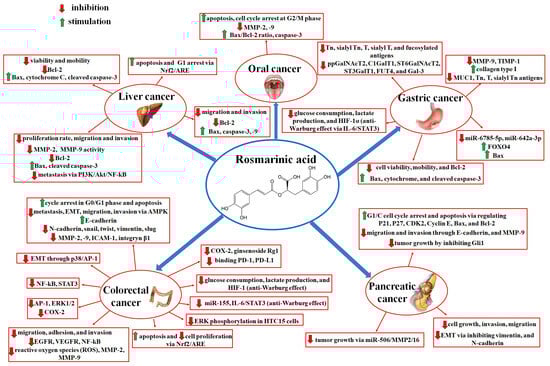 Summarized action of rosmarinic acid in oral [], colorectal [,,,,,,,,,,,,,,], pancreatic [,,], gastric [,,,,], and liver cancers [,,,].