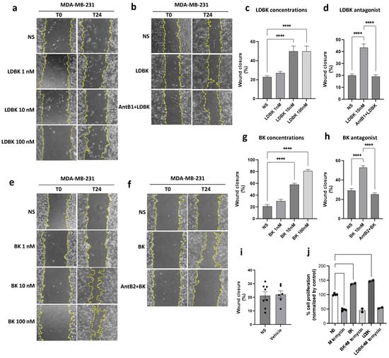 LDBK and BK, through B1 and B2 receptors, increase wound closure in MDA-MB-231 cells. (a,e): scratch assay in MDA-MB-231 cells treated with growing concentrations (1, 10, and 100 nM) of LDBK or BK; (b,f): the effect of B1 (AntB1) and B2 (AntB2) antagonists on wound closure induced by 10 nM of LDBK or 10 nM of BK, respectively (pictures magnification corresponds to 100×); (c,d,g,h): the graphs illustrate the closure percentage after 24 h of culture compared with non-stimulated cells (NS); (i) the graph exhibits the effect of the vehicle on wound closure in MDA-MB-231 cells after 24 h of scratch testing; and (j) the graph shows the effect of mitomycin C on the cell viability of MDA-MB-231 cells induced by LDBK and BK. Data are presented as the average ± standard error for at least three independent experiments. **** p < 0.0001. An ANOVA two-tailed test was used.