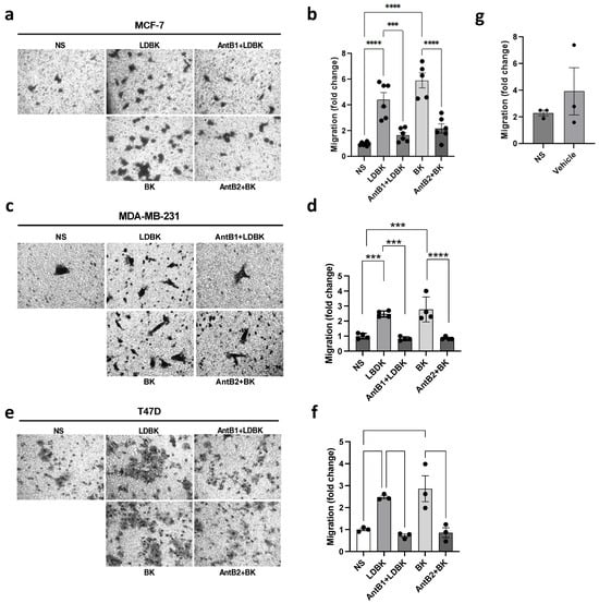 LDBK and BK, through B1 and B2 receptors, increase transwell migration in MCF-7, MDA-MB-231, and T47D cells. (a,c,e): the effects of LDBK and BK, and their antagonists, on transwell migration in MCF-7, MDA-MB-231, and T47D cells (pictures magnification corresponds to 400×); (b,d,f): the graphs show the fold change in stimulated migrating cells compared with the control. The number of migrating cells was normalized by the non-stimulated cells (NS), and (g) the graph shows the effect of the vehicle on the invasion of the MDA-MB-231 cells after 24 h of stimulus. Data are presented as the average ± standard error for at least three independent experiments. *** p < 0.001, and **** p < 0.0001. An ANOVA two-tailed test was used.