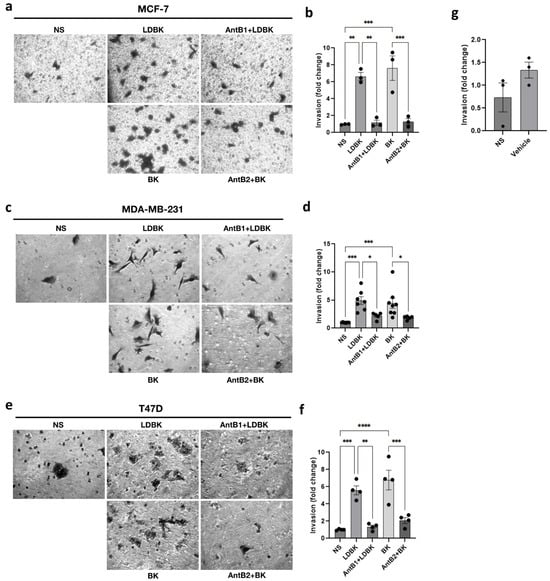 B1 and B2 receptors mediate the kinin-induced invasion of breast cancer cells. (a,c,e): the effects of LDBK and BK, and their antagonists, on Matrigel invasion in MCF-7, MDA-MB-231, and T47D cells (pictures magnification corresponds to 400×); (b,d,f): the graphs show the fold change in stimulated invasive cells compared with the control. The number of invasive cells was normalized by the non-stimulated cells (NS), and (g) the graph shows the effect of the vehicle on the invasion of MDA-MB-231 cells after 24 h of stimulus. Data are presented as the average ± standard error for at least three independent experiments. * p < 0.05, ** p < 0.01, *** p < 0.001, and **** p < 0.0001. An ANOVA two-tailed test was used.