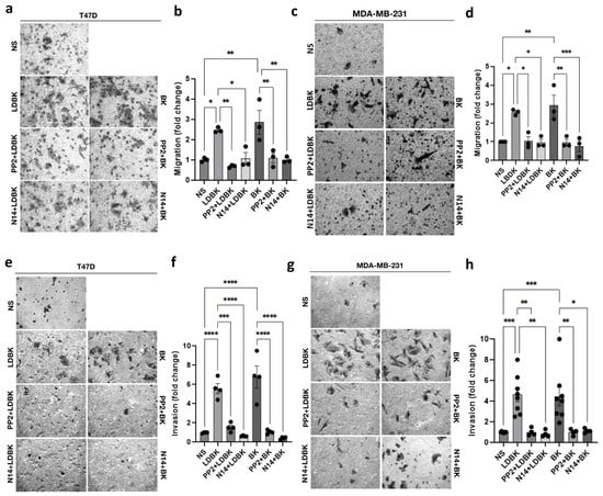 Migration and invasion induced by kinin nonapeptides in breast cancer cells are mediated by Src and FAK. (a,c): transwell assay of T47D and MDA-MB-231 cells incubated with Src (PP2) and FAK (N14) inhibitors before the addition of kinins. Cells non-stimulated with agonists or inhibitors were considered controls (NS); (b,d): the graphs show the fold change in the stimulated T47D and MDA-MB-231 migrating cells compared with the non-stimulated cells. The number of migrating cells was normalized by the control cells; (e,g): Matrigel assay of T47D and MDA-MB-231 cells incubated with PP2 and N14 inhibitors plus LDBK or BK for 24 h. Cells without stimuli were considered controls (NS); and (f,h): the graphs show the fold change in the stimulated T47D and MDA-MB-231 invasive cells compared with the non-stimulated cells. The number of invasive cells obtained in each condition was normalized by the control cells. Pictures magnification corresponds to 400×. Data are presented as the average ± standard error for at least three independent experiments. * p < 0.05, ** p < 0.01, *** p < 0.001, and **** p < 0.0001. An ANOVA two-tailed test was used.