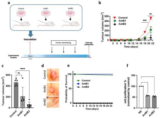 B1 and B2 antagonists impair tumor growth in vivo: (a) diagram of the protocol for breast cancer tumor formation based on the subcutaneous inoculation of MDA-MB-231 cells. Previously inoculated cells were treated for 24 h with B1 (AntB1) or B2 (AntB2) antagonists. Non-stimulated cells were used as controls; (b) tumor growth progression from the beginning to the 21st day; (c) tumor size at the end of the experiment (21st day); (d) representative pictures of tumor volume at different experimental conditions; (e) probability of the survival of mice under different conditions for 21 days; and (f) capacity of the proliferation of cells previously treated for 24 h with B1 and B2 antagonists. Data of six animals per group are presented as the average ± standard deviation. ** p < 0.01, *** p < 0.001, and **** p < 0.0001. A t-test was used.