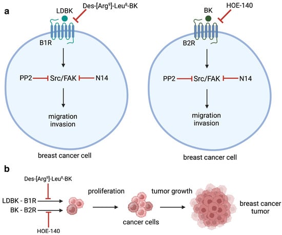 In breast cancer, B1 receptor expression has been detected on neoplastic tissue from both benign and malignant tumors. Similarly, breast cancer cell lines also express the B1 receptor [,,]. Furthermore, both agonists, BK and DBK, have been found at elevated levels in the serum of breast cancer patients []. Notably, these levels decline following tumor removal, which parallels the findings in patients with cervical cancer [].
