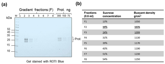Proteasomes are among the smallest structural elements in cells. They are minimally composed of 28 protein subunits. Extracellular circulating 20S proteasomes were previously detected in animals (including fetal calf serum) and humans [22,23,24]. As a result, proteasome “contamination” of FBS could be anticipated. Therefore, the initial part of the study was focused on the proteasome parameters. We estimated the buoyant density of 20S core particles using as a reference highly purified commercial 20S proteasomes. One μg of the commercial sample was diluted in 500 μL of TN buffer and was loaded on a 15–60% sucrose density gradient. After ultracentrifugation, eight fractions (F) were collected, and buoyant density was estimated; samples were pelleted and dissolved in PBS to obtain samples concentrated 250 times. The samples were examined using gradient SDS-PAGE followed by gel staining with ROTI Blue quick dye. In our hands, the protein detection limit was 25 ng–50 ng per band. The revealed protein pattern included three discrete protein bands and two protein pairs (proteins with close MW underlined): 25.7; 26.4; 27.3; 27.8; 28.3; 29.5; 29.8 kDa. It was shown that proteasome subunits located predominantly in F2 (buoyant density 1076 g/cm3) (Figure 1a). Only traces of proteasome subunits were present in F3 (buoyant density 1099 g/cm3) (Figure 1a).