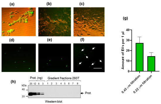 To estimate amounts of budding EVs, we used HEK293T cells that express an enhanced green fluorescent protein (EGFP). To prevent contamination with vesicles from FCS, we substituted the FCS-containing medium with the FCS-free medium. Sixteen hours post-splitting expression of EGFP in cells was detected (Figure 2a). Quantification of fluorescent EVs in cell supernatant was performed after 72 h (Figure 2b,c). Cell supernatant was twice centrifuged at a low speed and filtered. Half of the supernatant was filtered through the 0.45 μm membrane (Figure 2d,e), and the other half was filtered through the 0.22 μm membrane (Figure 2f), respectively.