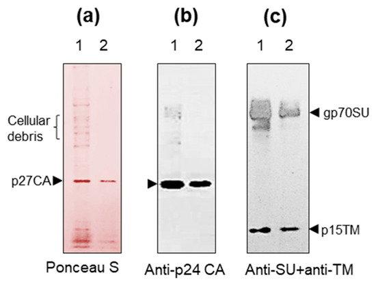 After SDS-PAGE and protein transfer, the nitrocellulose membrane was stained with Ponceau S to confirm the quality of transfer (Figure 4a). Western blot analyses were performed using anti-p27CA (Figure 4b), and after stripping, the membrane was treated with mixed anti-gp70SU and anti-p15TM sera (Figure 4c). For further experiments, we used the second procedure of purification, as the number of cellular-specific proteins was significantly reduced, even though the amount of virus-specific protein was diminished (Figure 4).