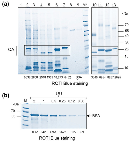 Protein pattern of retroviruses after sucrose gradient centrifugation. Estimation of the CA contents. (a) Examined fractions with buoyant density 1.15 g/cm3–1.17 g/cm3. Track 1—HEK293T (negative control); Tracks 2,3—exogenous JSRV load 7 μL; Track 4—pNLAEKA load 7 μL; Track 5-pNLd load 7 μL; Track 6—endogenous FeLV load 1 μL; Track 7—endogenous RD-114 load 1 μL; Track 8-BSA 250 ng; Track 9—BSA 125 ng; Track 10—exogenous MMTV load 5 μL; Track 11—endogenous RD-114 load 1 μL; Track 12—endogenous FeLV load 1 μL; Track 13—endogenous PERV load 7 μL. CA proteins are given in a frame. (b) Serial two-fold dilutions of bovine serum albumin (BSA) were used as a reference for the CA of retroviruses. Centrifugation was performed for 2 h at 110,000 rpm. Numbers below the figures (a,b) represented relative band intensity estimated using ImageJ software. Viruses (tracks 2, 4, 6, 7, 10, 11, 12, 13) selected for further proteasome analyses are underlined. Gels were stained with ROTI Blue quick (Carl Roth, Karlsruhe, Germany). M+-color gel markers mixed with ECL markers.