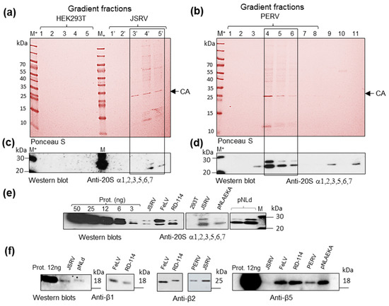 Proteasome α and β subunits were detected in sucrose gradient fractions of JSRV, PERV, FeLV, RD-114, and recombinant HIV-1 (pNLd and pNLAEKA). (a) Nitrocellulose membrane after SDS-PAGE, protein transfer and Ponceau S staining. The membrane contains gradient fractions F1–F5 of the supernatant from HEK293T cells and fractions F1′–F5′ obtained from supernatant of JSRV-producing cells. CA (arrow) indicates JSRV capsid proteins. Numbers above the image indicate fraction numbers. (b) Nitrocellulose membrane containing gradient fractions F1–F8 from the supernatant of PERV-producing cells stained with Ponceau S. CA (arrow) indicates PERV capsid proteins. Numbers above the image indicate fraction numbers. Track 9: PERV gradient fraction F3 grown on FCS-free medium. Track 10—gradient fraction F4 obtained from the supernatant of non-infected HEK293T cells (control). Track 11—20S proteasome 3 ng (control). (c) Western blot analysis of gradient fractions F1–F5 from HEK293T cells and gradient fractions F1′–F5′ from JSRV-producingcells with antibodies to 20S proteasome α 1, 2, 3, 5, 6, 7 subunits. (d) Western blot analysis of proteasome control and gradient fractions obtained from PERV-producing cells with antibodies to 20S proteasome α 1, 2, 3, 5, 6, 7 subunits. (e) Serial dilution (from 50 ng to 3 ng) of commercial 20S proteasome (Enzo, Farmingdale, NY, USA) and detection of proteasome alpha subunits in retroviruses from gradients fractions (F4, F5) using anti-20S proteasome α 1, 2, 3, 5, 6, 7 serum. (f) Detection of proteasome beta subunits in fractions of gradient purified retroviruses by Western blotting using anti-β1, anti-β2, and anti-β5 antibodies. Isolated viruses were from fractions F4 and F5. The 12 ng of commercial 20S proteasome (Enzo, Farmingdale, NY, USA) was used as the positive control. M+-Size markers mixed with ECL-size markers. Positions of marker proteins are indicated with bars.