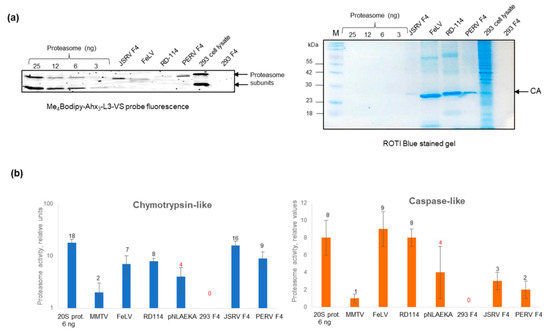 To determine the functionality of viral-associated proteasomes, we used cell-permeable proteasome activity probe Me4BodipyFL-Ahx3Leu3VS. Analysis of gels containing samples following the incubation of virus preparations with the probe revealed that JSRV (F4) and PERV (F4) contain active proteasome subunits with activity comparable to 3–6 ng of purified human 20S proteasome (Figure 7a). In the case of FeLV and RD-114, the activity was also detected, although revealed bands (FeLV) were positioned differently. No signal was seen in HEK293T (F4) (Figure 7a).