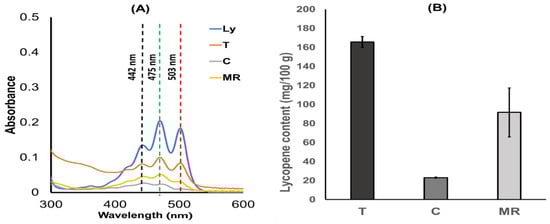 (A) UV-VIS spectra of standard lycopene (Ly), tomato (T), carrot (C), mixed red vegetable (MR), and (B) lycopene content in tomato (T), carrot (C), and mixed red vegetable (MR).