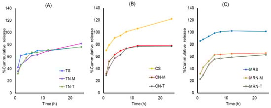 Comparison of lycopene-release profiles from (A) tomato extract solution (TS), niosome-entrapped tomato extract prepared by MF method (TN−M) and THF method (TN−T); (B) carrot extract solution (CS), niosome-entrapped carrot extract prepared by MF method (CN−M) and THF method (CN−T); (C) mixed red vegetable solution (MRS), niosome-entrapped mixed red vegetable prepared by MF method (MRN−M) and THF method (MRN−T).