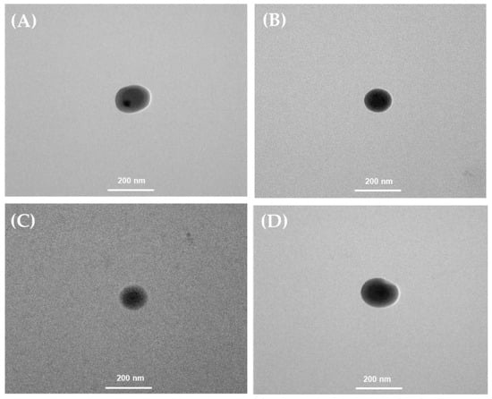 The morphology of niosome formulations prepared by the THF method imaged (magnification ×25,000) using transmission electron microscopy (TEM): (A) blank niosome formulation (BN); (B) niosome-entrapped tomato extract (TN); (C) niosome-entrapped carrot extract (CN); (D) niosome-entrapped mixed red vegetable extract (MRN).