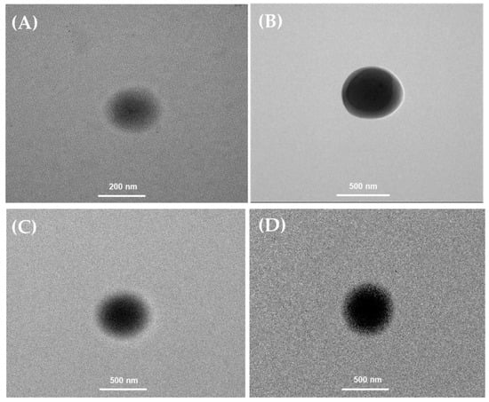 TEM micrographs of niosome formulations prepared by the THF and MF methods revealed spherical unilamellar structures with particle sizes ranging from 245.17 to 457.47 nm for the THF method, and 237.97 to 281.73 nm for the MF method (Figure 3 and Figure 4). The morphology of spherical vesicles surrounded by a thin layer was consistent with a previous report of lycopene–niosomes [].