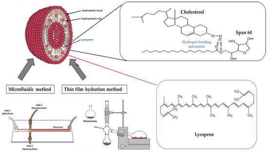Illustration of the interaction between lycopene and Span 60 and cholesterol in niosome formations prepared by the microfluidic method and the thin-film hydration method.
