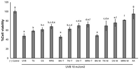 Viability of HaCaT cells exposed to UVB radiation (UVB) and pretreated with tomato (TS), carrot (CS), and mixed red vegetable extracts (MRS), niosome formulations prepared by thin-film hydration method (BN−T, TN−T, CN−T, MRN−T), niosome formulations prepared by microfluidic method (BN−M, TN−M, CN−M, MRN−M), and 50 µg/mL ascorbic acid (AA). Data represent the mean ± SD values of three replicates. Significance was evaluated by the Duncan’s test (p < 0.05). Letters a–g indicate significant differences between the groups.