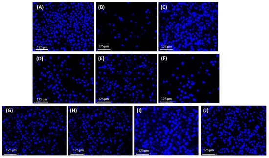 Morphology of HaCaT cells using fluorescence (DAPI) staining: non-treated cells (A), cells exposed to 10 mJ/cm2 UVB radiation (B), and UVB radiation of HaCaT cells after 24 h of pretreatment with ascorbic acid 50 µg/mL (C), tomato (D), carrot (E), mixed red vegetables (F), BN−M (G), TN−M (H), CN−M (I), MRN−M (J).