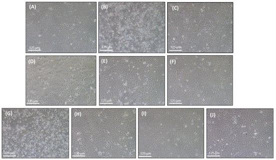 Morphology of HaCaT cells: non-treated cells (A), cells exposed to 10 mJ/cm2 UVB radiation (B), and UVB radiation after 24 h of pretreatment with ascorbic acid 50 µg/mL (C), tomato (D), carrot (E), mixed red vegetables (F), BN−M (G), TN−M (H), CN−M (I), MRN−M (J).