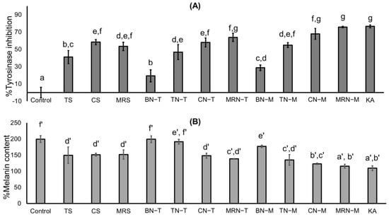 Effect of tomato (TS), carrot (CS), and mixed red vegetable extracts (MRS), niosome formulations (blank niosome (BN−T), TN−T, blank−niosome (BN−M), TN−T, CN−T, MRN−T, blank niosome (BN−M)), TN−M, CN−M, MRN−M) and 100 µg/mL kojic acid (KA) on B16F10 melanoma cells stimulated by α-melanocyte-stimulating hormone (α-MSH): tyrosinase inhibition (A) and melanin content (B). Control was B16F10 melanoma cells stimulated by α-MSH without sample treatment. Data represent the mean ± SD values of three replicates. Significance was evaluated by Duncan’s test (p < 0.05), letters a–g indicate significant differences in tyrosinase inhibition between the groups, and letters a′–f′ indicate significant differences in melanin content between the groups.