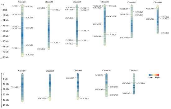 Locations of the 51 CrCaMs/CrCMLs on 11 chromosomes of Canavalia rosea. Seven CrCaM genes were labeled with *.