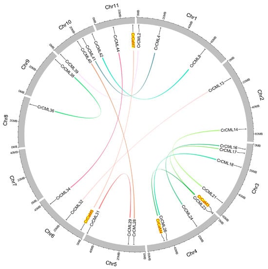 The distribution of segmental duplication of CrCaMs/CrCMLs in Canavalia rosea chromosomes. Two CrCaM gene pairs (CrCaM3 and CrCaM4, CrCaM5 and CrCaM7) were marked with yellow background and red font.