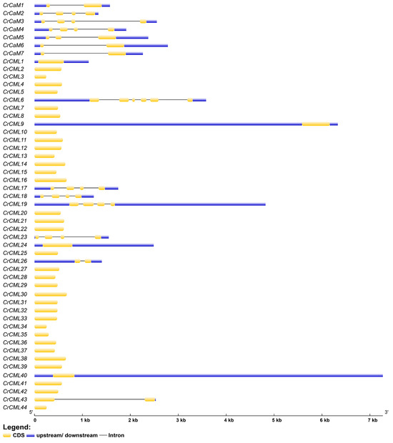 Exon–intron structures of the CrCaMs/CrCMLs predicted using the Gene Structure Display Server (GSDS, http://gsds.cbi.pku.edu.cn/, accessed on 10 April 2024).