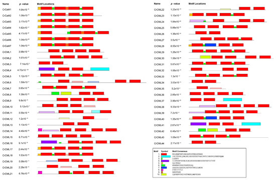 The CrCaM/CrCML conserved motifs were also demonstrated using MEME analysis, and ten distinct motifs were identified (Figure 4). Motif 1 represents the typical EF-hand, and it was present in all CrCaMs with four repetitions. Most of the CrCMLs (23 of 44 CrCMLs) also contained four EF-hand motifs, while their conservativeness was inferior to that in the CrCaMs. In some CrCMLs (CrCML4, CrCML8, CrCML16, CrCML28, CrCML30, CrCML37, CrCML40, CrCML41, and CrCML42), motifs 2, 4, 7, and 10 replaced the EF-hand motif, which might indicate that these CrCMLs are more diverse than the CaM proteins. Therefore, the complicated and changeable functions of the CrCML members can also be further inferred.