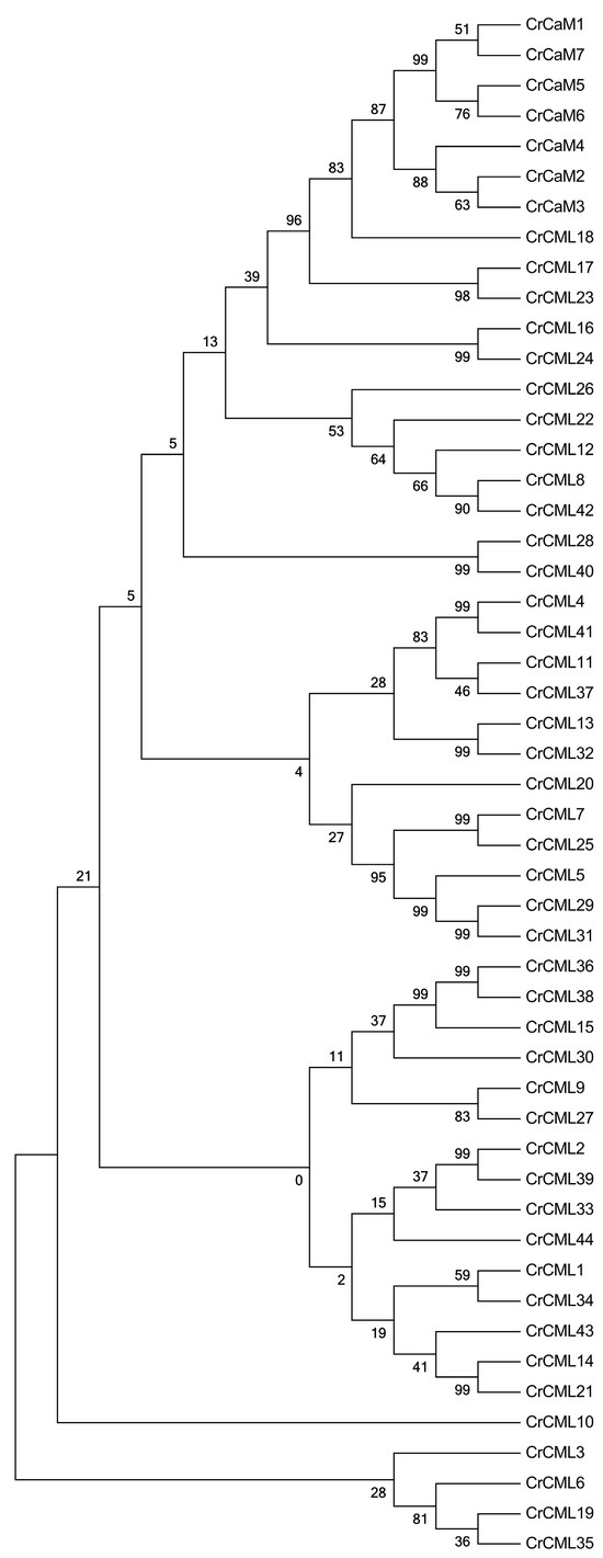 The phylogenetic tree of the CrCaMs/CrCMLs constructed using MEGA-X (version 10.1.8).