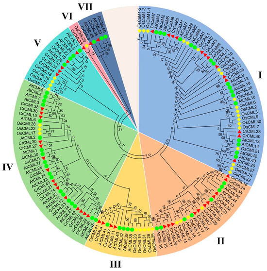 To characterize the phylogenetic relationships of all of the CrCaM/CrCMLs with similar members in the other species, we also inferred the phylogenetic relationships of the CaM/CMLs among C. rosea, rice, and Arabidopsis using the protein sequences of 57 AtCaM/AtCMLs, 37 OsCaM/OsCMLs, and 51 CrCaM/CrCMLs into seven cluster groups (containing 49, 23, 14, 37, 13, 2, and 5 members in each group) (Figure 6). These groups were designated as I to VII, containing 13, 11, 4, 15, 5, 1, and 2 CrCaM/CrCMLs, respectively. Overall, the CrCaMs showed relatively high levels of similarity with those CaMs of other species, and they were highly conserved. The CMLs demonstrated relatively higher variability and diversity than CaMs. This was also consistent with the conserved motif analysis using MEME (Figure 4).