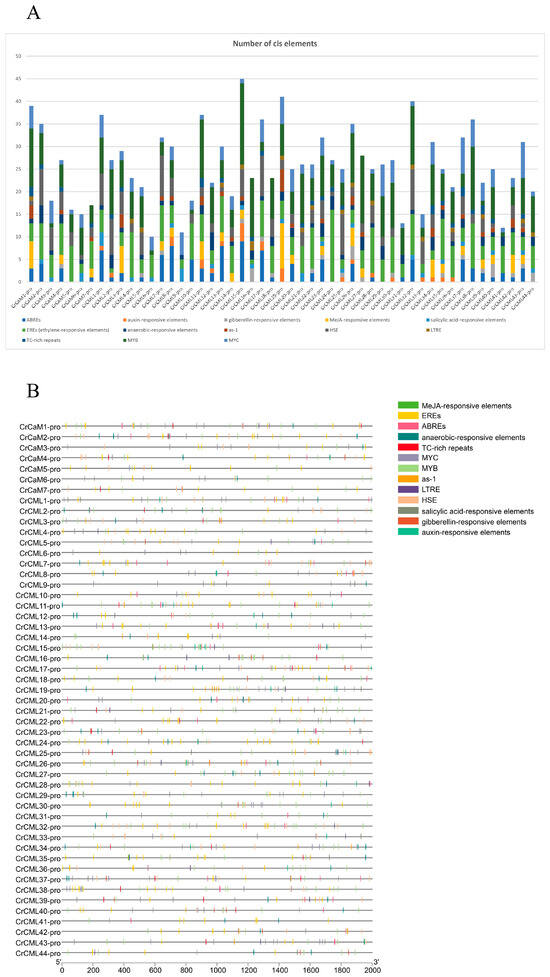 The predicted cis-regulatory elements (CEs) were scanned using the PlantCARE program (http://bioinformatics.psb.ugent.be/webtools/plantcare/html/, accessed on 10 April 2024) by searching for the promoter regions (2000 bp upstream from the translation start site ATG) of all the CrCaMs/CrCMLs. These CEs were classified into hormone-specific (ABREs, auxin-responsive elements, gibberellin-responsive elements, MeJA-responsive elements, salicylic acid-responsive elements, and EREs) and environmental or development-responsive (anaerobic-responsive elements, as-1, HSE, LTRE, TC-rich repeats, MYB, and MYC), and are summarized in Table S2. The CE analysis results were visualized and mapped to the CrCaM/CrCML promoters using TBtools software (version: 0.67) [53].