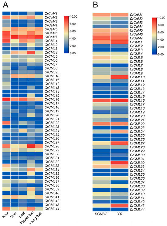 Heatmaps showing (A) the expression levels of the CrCaMs/CrCMLs in the root, vine, leaf, flower bud, and young fruit of Canavalia rosea plants and (B) the expression differences in the CrCaMs/CrCMLs in mature C. rosea leaves planted in the South China National Botanical Garden (SCNBG) and in Yongxing (YX) Island.