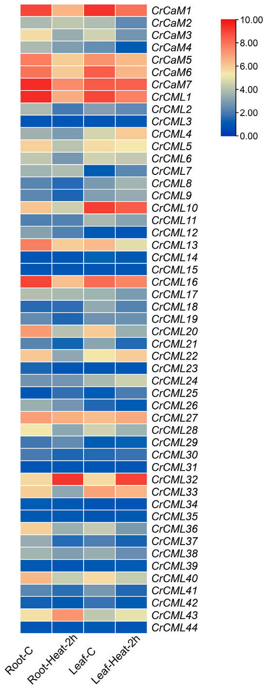 The CaM or CML genes isolated from special-habitat plants that had heterologous transgenic experiments performed provided further evidence of their clear functions for environmental stress responses [24,27]. C. rosea is a unique plant that is adapted to specialized habitats, thriving especially on coral reefs. This suggests that the species can withstand various environmental challenges, such as drought, high osmotic pressure, salinity/alkalinity, heat, and intense bright light or high ultraviolet radiation. Furthermore, whether the halophyte C. rosea’s CaM/CML genes can also function in multiple environmental conditions has also become an interesting research topic. To recognize the role of heat-related signaling responses in the regulation of CrCaMs/CrCMLs, an expression analysis was performed with plants treated with heat (42 °C) using RNA-sequencing. Both in the root and in leaf samples, more than half of the CrCaMs/CrCMLs exhibited obvious expression alterations and were up- or down-regulated by heat challenge (Figure 9). In general, in both the root and leaf samples, a large proportion of the CrCaMs/CrCMLs showed decreased expression levels under heat stress. However, in two C. rosea’s tissues, several noticeably up-regulated CrCaMs/CrCMLs members raised concern, including CrCaM2, CrCML7, CrCML32, and CrCML43 in roots and CrCML4, CrCML8, CrCML22, CrCML24, CrCML27, CrCML32, and CrCML43 in leaves. This suggests that the above CrCaM/CrCML members were genes with different but unique potential biological functions in the heat responses of C. rosea plants.